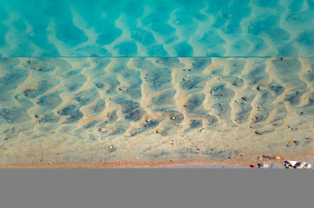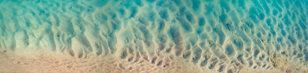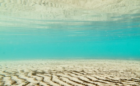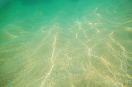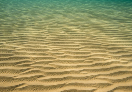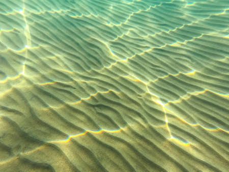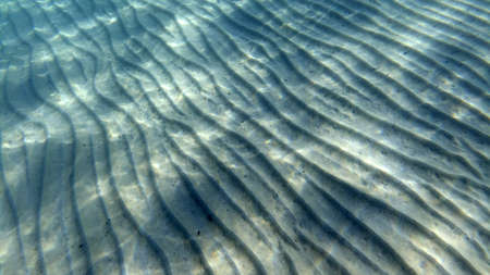 Underwater background with sand ripples on the seabed in clear turquoise water. A peaceful and serene natural summer vacation scene.