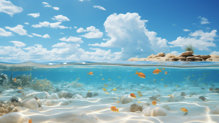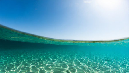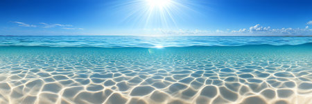 Tranquil Ocean View Sunlight Glimmering on Crystal Clear Water Above a Sandy Seabed Under Blue Sky