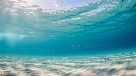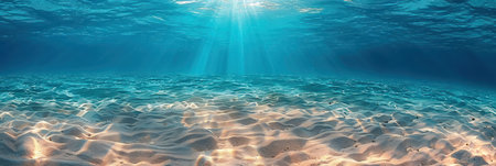 Underwater Scene with Sunlight Streaming Through Clear Blue Ocean Water and Sandy Ocean Floor
