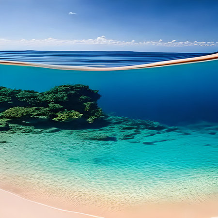 Azure waters lap at a pristine beach, where swaying palms and a vibrant coral reef paint a serene paradise under the sun's warm embrace.