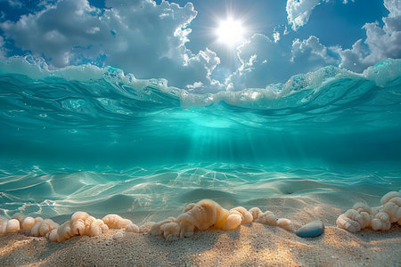 Discover a serene underwater scene where bright sunlight filters through crystal-clear ocean water, illuminating the sandy seafloor with tranquil beauty.