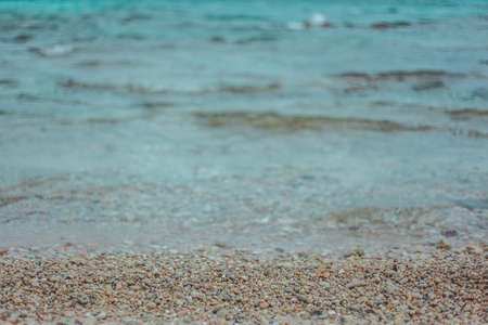A closeup of small stones on the beach surrounded by the sea under sunlight with a blurry background