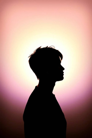 Silhouette of a young man on a pink background with a beautiful light