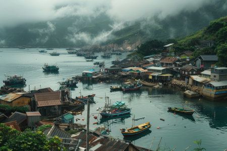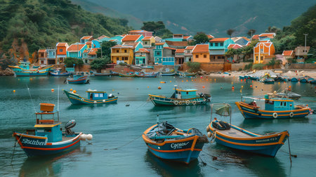 A body of water teeming with numerous boats, showcasing a bustling fishing village scene, A charming fishing village nestled along the shoreline