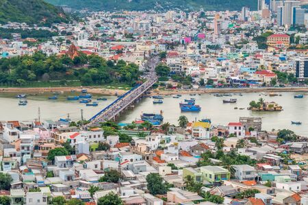 Downtown Nha Trang, Khanh Hoa from Po Nagar Cham tower at the mouth of Cai River, view of Tran Phu and Xom Bong bridges, wooden fishing boats anchor on brackish water at Cu Lao village. Vietnam