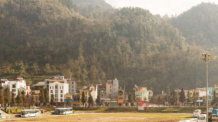 Sapa, Vietnam - January 14, 2018: View of buildings on the background of mountains in the morning on a winter day Sapa