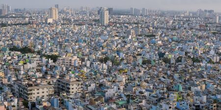 Ho Chi Minh City skyline aerial view with small colored residential houses, medium class district of the capital of Vietnam