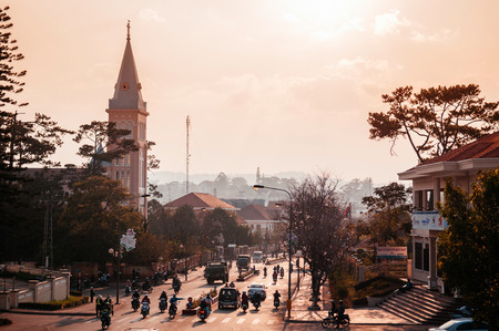 FEB 26, 2014 Dalat, Vietnam - Warm sunset light silhouette motorcycle traffic in evening at Da Lat Cathedral with Purple orchid tree
