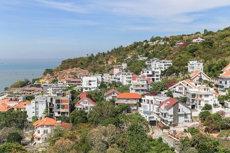 Aerial view on Vung Tau, Vietnam which is the popular beach city. There are crowded small building close to the sea and mountain.