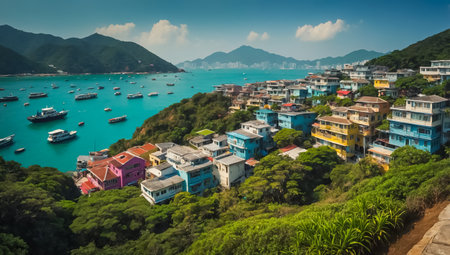Aerial view of Po Toi O, a fishing village in Hong Kong with floating rafts. Generative AI