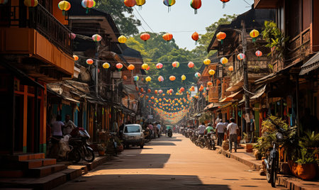 Aerial view of a bustling street market in a historic city, capturing culture, commerce, and community, vibrant and busy.