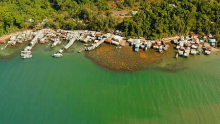 Houses community standing in water in fishing village. City port on Balabac island, Palawan, Philippines. Old wooden house standing on the sea in the fishing village