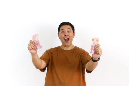 An Indonesian Asian man holds money, cheering and expressing excitement about good news or a financial win.