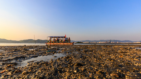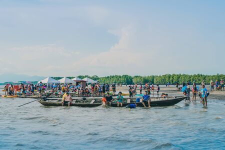 CHANTHABURI, THAILAND: APRIL 15, 2019 Unidentified Tourists travel by raft boats to relax on the tombolo part of the sea on april 15,2019 at Bang Chan (The No-Land Village), Chanthaburi, Thailand