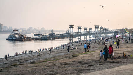 Wuhan China, February 14, 2021: Crowd of people enjoying 2021 Chinese new year week holidays on Yangtze riverbanks in Wuhan Hubei China