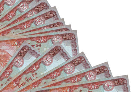 20 Nepalese rupees bills lies isolated on white background with copy space stacked in fan close up. Payday time concept or financial operations
