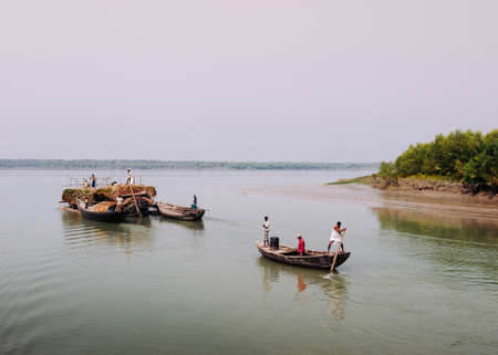 FEB 15, 2012 Dhaka, Bangladesh - Bangladesh local people on wooden row boat in river with tropical mangrove forest. Poverty social in South Asia