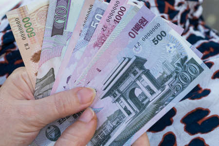 A woman is holding North Korea currency in her hand. Hands on the background of the dress. Economic crisis