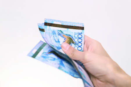 Counts banknotes of tenge national currency of Kazakhstan. White background