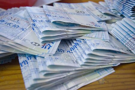 Stack of ringgit Malaysia money banknotes in a row isolated on a white background