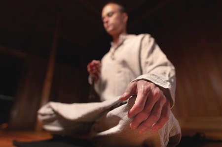 close-up man in clothes for practice and meditation sits in a lotus pose and holds red rosary to concentrate attention in a wooden room with dim light