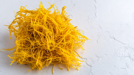 A close-up shot of Fios de Ovos, a traditional Portuguese and Thai dessert made from egg yolks, sugar, and water, arranged in a delicate golden nest on a clean white surface.