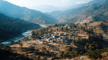 A scenic view of a small village nestled in a valley, surrounded by forests and a flowing river.