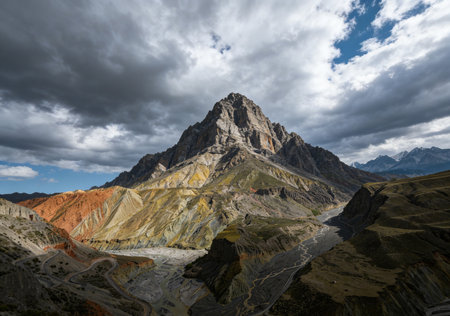 Motley autumn landscape with yellow larches on hills and beautiful rocky mountains in sunlight under clouds in blue sky. Multicolor mountain scenery with unusual rocks in autumn colors in sunshine.