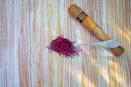 top view of pile of crocus saffron threads close up on gray ceramic plate