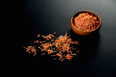 Dried safflower for herbal tea on white background, dry safflower petals, Saffron substitute
