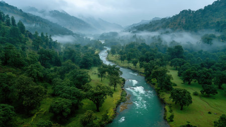 Aerial view of a picturesque landscape featuring a vibrant blue river meandering through a lush green valley, enveloped by misty mountains