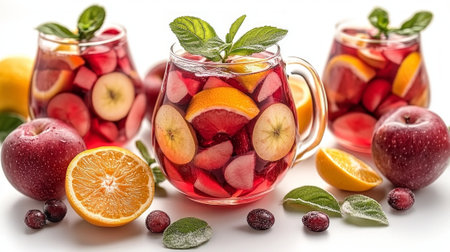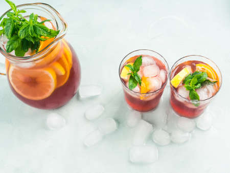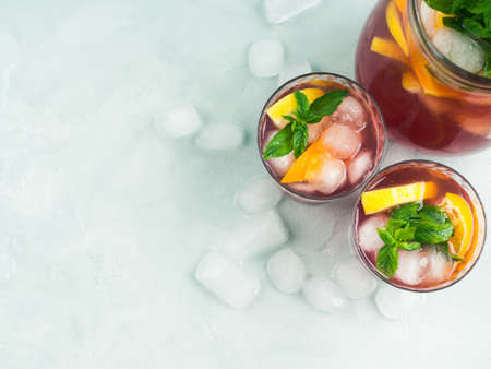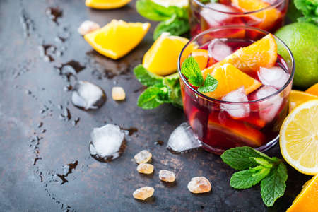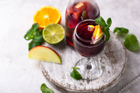 Sangria with fruit, ice and mint in glass. Summer alcohol drink and ingredients.
