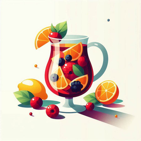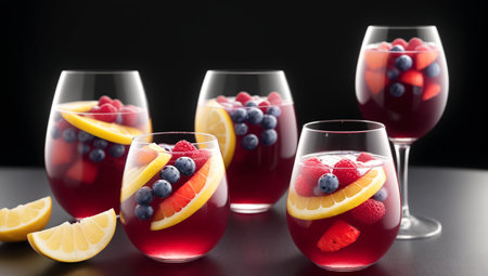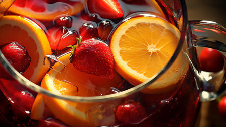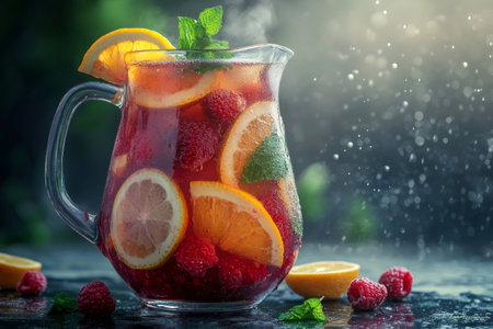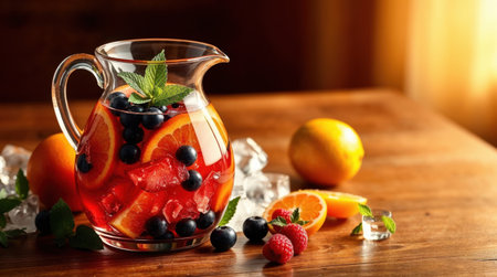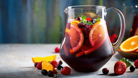 A pitcher of sangria with floating citrus fruits and berries, infusing the wine with fruity flavors and vibrant colors.