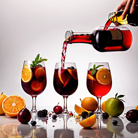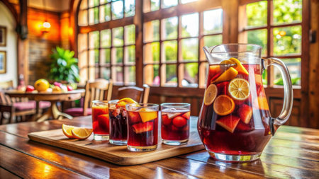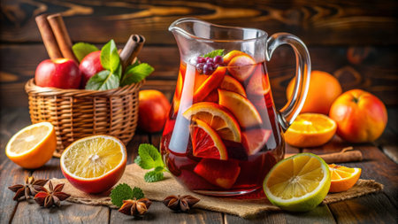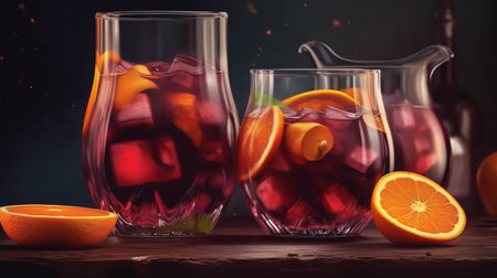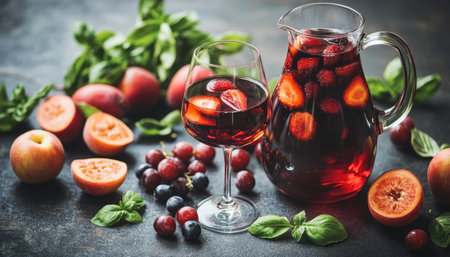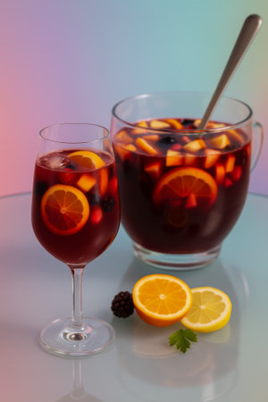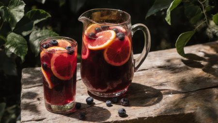 Rich red wine blends fresh fruits striking pitcher inviting refreshment and celebration festive occasions warm summer days.