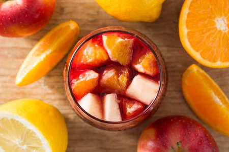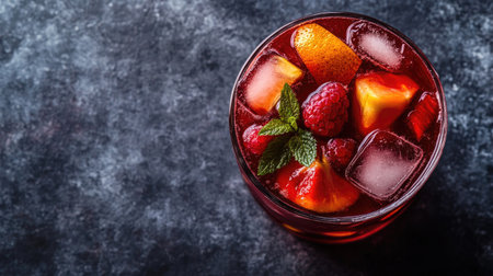 Top view of a glass of Spanish sangria with fresh fruit, with ample copy space.