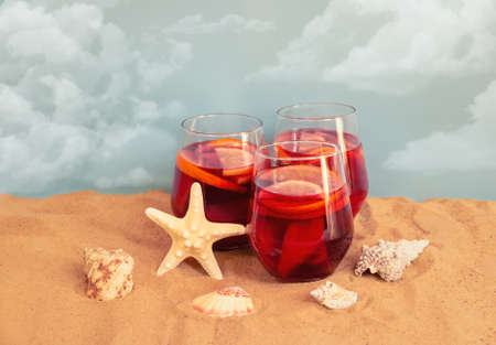Red wine sangria with fruits in glasses, starfish and seashells on sand beach.