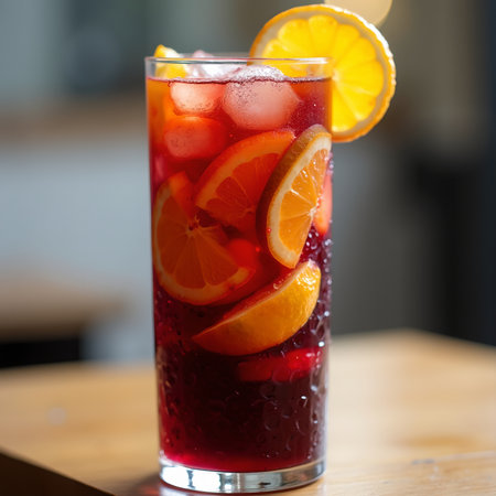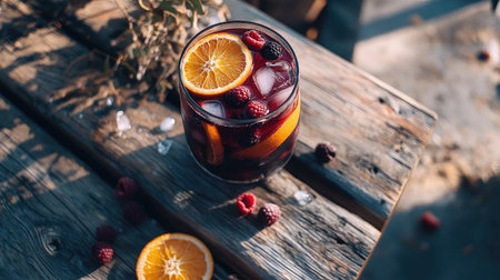 A vibrant summer drink featuring fresh oranges and berries over ice. Perfect for outdoor gatherings, this refreshing beverage captures the essence of summer.
