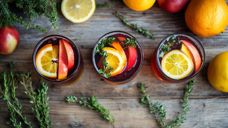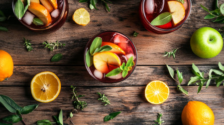 Red wine sangria in glasses on wooden table. Top view.