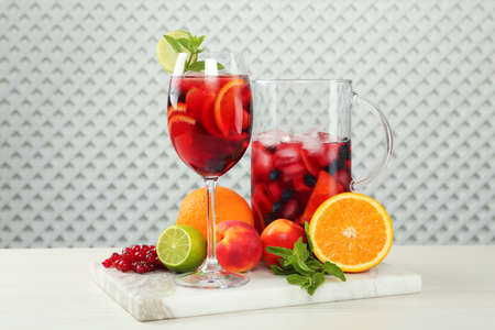 Glass and jug of Red Sangria with fruits on white wooden table