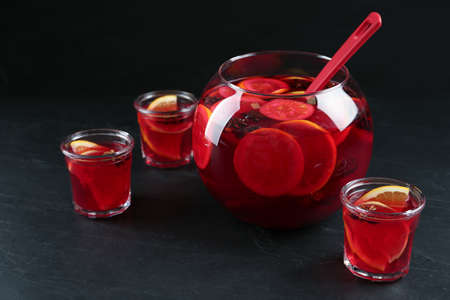 Glasses and bowl of delicious aromatic punch drink on black table