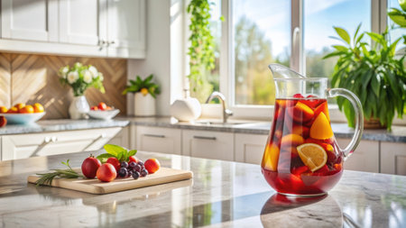 Refreshing sangria in a glass jug on the kitchen table