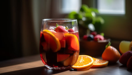 Juicy berry cocktail with fresh citrus slices on rustic wooden table generated by artificial intelligence