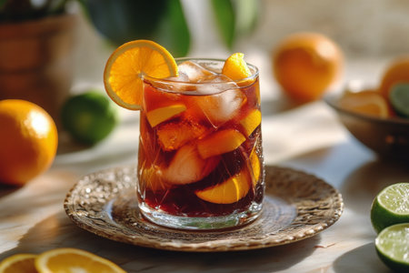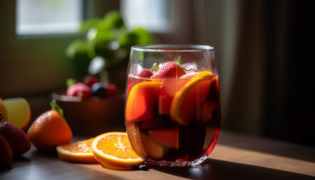 sangria glass with fruit garnish and beach umbrella shadow, created with generative ai