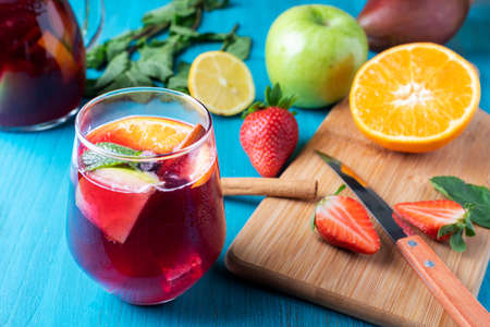 Glass with sangria, typical Spanish drink, along with some of the fruits that the drink contains, as well as mint and cinnamon.