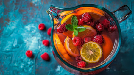 Glass pitcher full of refreshing summer drink with raspberry, lemon, orange and mint