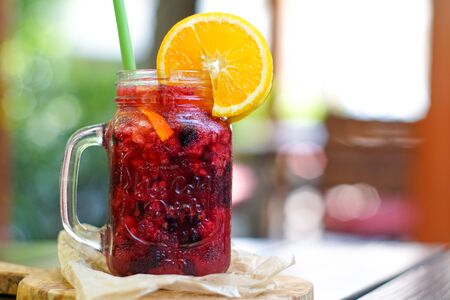 Sangria with fruits and ice on wooden table in cozy cafe