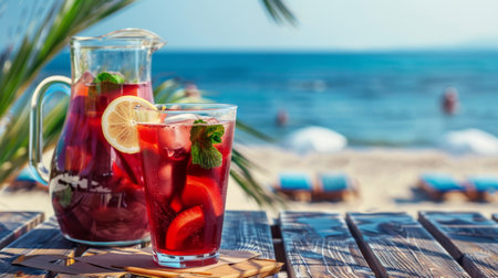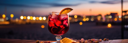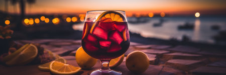 a refreshing glass of sangria with a beach sunset in the distance, created with generative ai