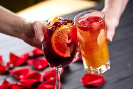 Drinking sangria. Glass of sangria aperitif beverage. Summer drink. Cocktail in bar. Sangria pitcher drink. Aperitif in the bar. Summer refreshing cocktail