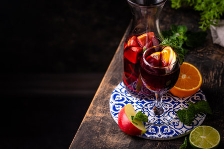 homemade red wine sangria with fruits and berries, selective focus, dark background