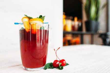 Refreshing cold sangria or punch with fruits in glasses in street cafe during hot day